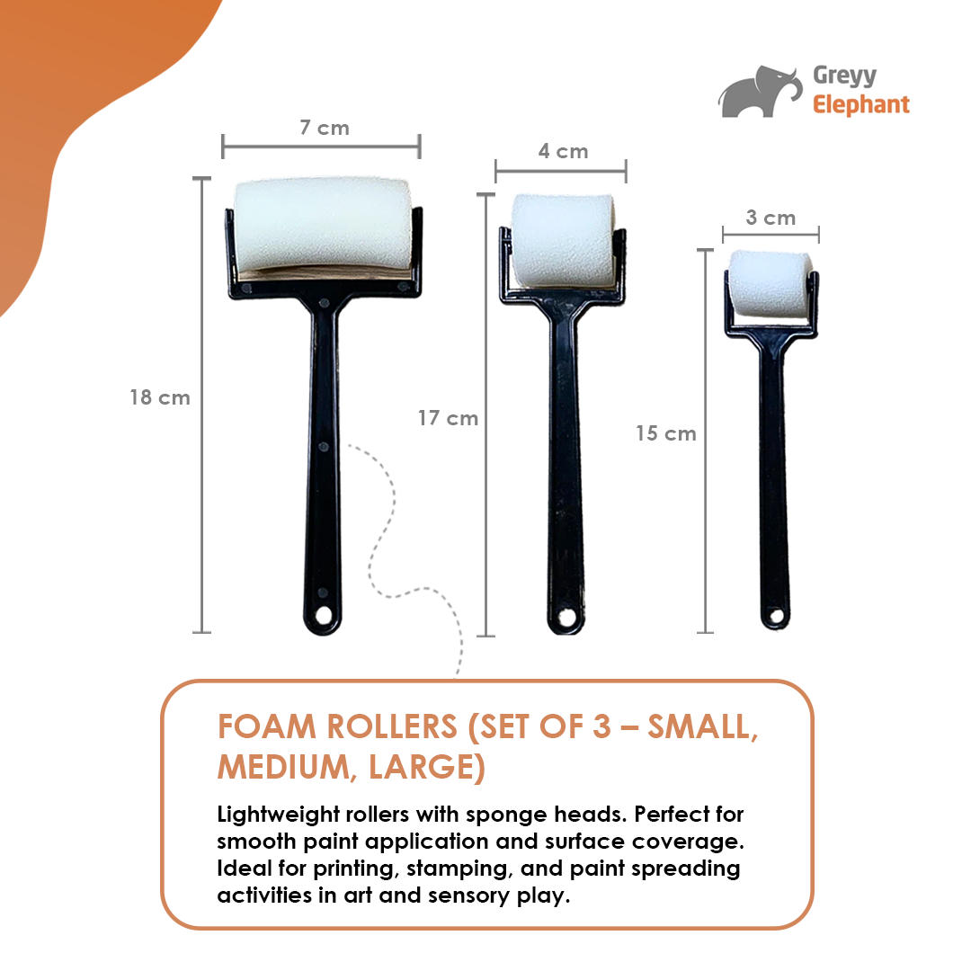 Get ready to roll, print, and play with this versatile Foam & Texture Roller Set-perfect for little artists! With smooth sponge rollers in three sizes and a fun textured roller, kids can explore paint coverage, patterns, and pressure through hands-on creativity. Ideal for sensory art, early motor skill building, and messy play magic!