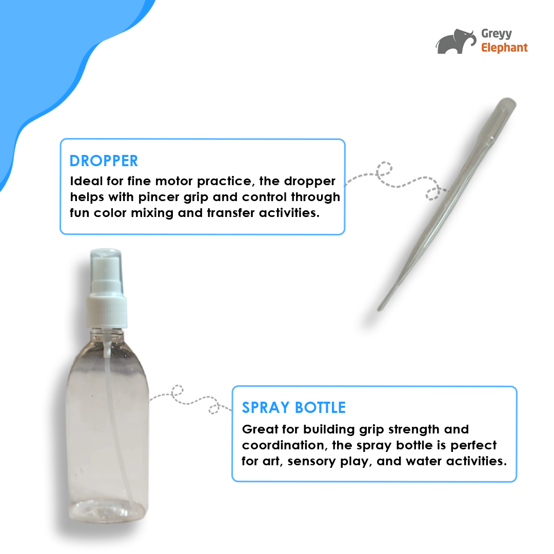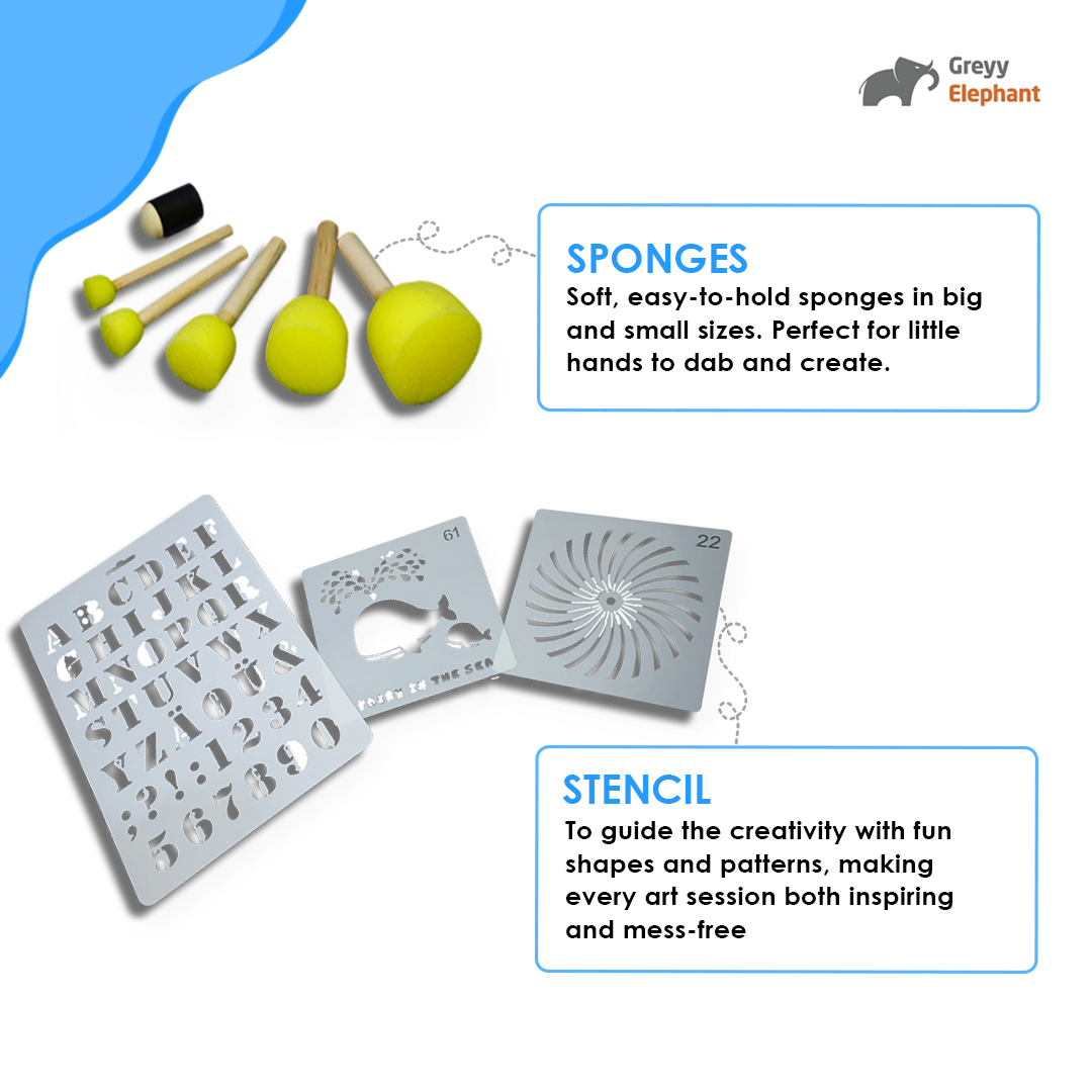 Encourage creative expression and fine motor skills with the Sensory Art Explorers combo. It includes 3 Fun Stencils, 6 Sponge Dabbers of different sizes, a Spray Bottle, and a Dropper. Perfect for introducing toddlers and preschoolers to different art techniques like dabbing, spraying, and dripping. A wonderful blend of art and sensory play that keeps little hands engaged and minds curious.